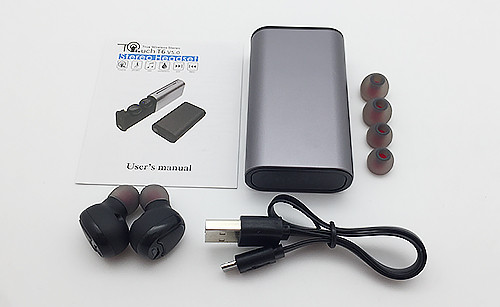 Повна комплектація товару проста і лаконічна. Так, всередині коробки знаходяться зарядний кейс, бездротові навушники, інструкція англійською мовою, USB шнур для зарядки кейса і дві пари змінних силіконових насадок. Насадки різного розміру, тому Ви без праці підберете оптимальний для себе варіант.